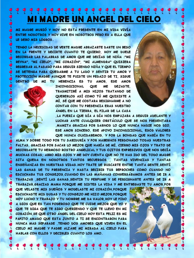 Angel Mi Madre En El Cielo : Ya no estás, siento mucha soledad, mucha tristeza y todo lo que me rodea me recuerda a ti, te veo en mis flores, en mis prendas de ropa y en todo de mi vida cotidiana… porqué siempre estabas aquí, mirando y riéndote de mis locas aventuras que te contaba.